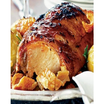 The pork loin roasting joint is a cut of pork that comes from the back of the pig, running along the spine. It’s typically a boneless joint but can be done bone-in, and it’s known for being lean and tender. The meat has a light pinkish color and is often covered with a thin layer of fat before the crisp crackling. If it’s bone-in, you’ll see the rib bones, and if it’s boneless, the meat is shaped into a tight, compact roast. The roast usually has a mild flavour, and the skin on top crisps up beautifully when roasted, adding both texture and richness to the dish. You can season it with a variety of herbs, spices, or marinades to enhance its flavour before cooking.